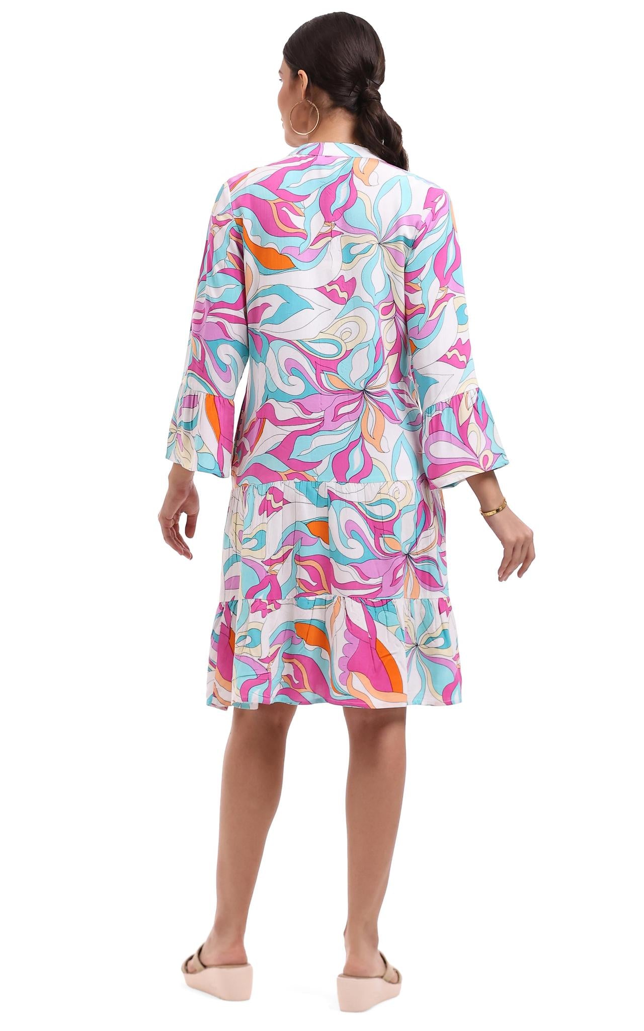 Key Features Brand: Parsley & Sage Colorful abstract swirl print Split V-neckline Three-quarter sleeves Tiered skirt design Knee-length hem Lightweight & breathable Relaxed, flattering fit Easy pull-on style