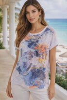 Elevate your everyday style with this stunning Picadilly Abstract Art Tee — where modern artistry meets effortless resort chic. Featuring a soft watercolor-inspired blend of blues, corals, golden yellows, and subtle lavender tones, this lightweight top brings wearable art to your wardrobe. The eye-catching abstract print is enhanced with sleek black studded accents for a subtle touch of shimmer and dimension. Designed with a relaxed silhouette, classic crew neckline, and soft rolled short sleeves, this tee drapes beautifully and pairs effortlessly with white denim, cropped pants, or summer shorts. Perfect for vacation days, brunch in Naples, or effortless everyday style, this Picadilly tee is modern, artistic, and unmistakably chic.