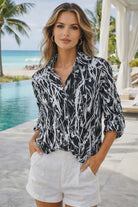 Make effortless style your signature with this Sno Skins Crinkle Poly Blouse, designed and Made in the USA for women who love comfort without sacrificing polish. Featuring a striking black and white abstract print, this lightweight blouse offers a relaxed yet flattering silhouette that transitions seamlessly from resort days to casual evenings. Crafted from travel-friendly crinkle poly fabric, it resists wrinkles and packs beautifully—making it a go-to piece for vacations, brunch dates, and everyday wear. The button-front design, classic collar, and roll-tab sleeves add timeless versatility, while the breathable feel keeps you comfortable in warm weather. Style it with white jeans, linen pants, or denim for an effortlessly chic look that feels modern, artistic, and easy.