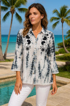 Key Features: Brand: Parsley & Sage Color: Black & White Tie-Dye for unique finish Button-front closure Detailed black floral embroidery Sheer lace insets under embroidery Pintuck pleats along front Flared 3/4 sleeves with lace trim Lightweight cotton blend fabric Relaxed, flowy fit for comfort Ideal for resort, vacation, and casual wear Each piece is individually crafted and unique