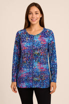 Keywords: scuba tunic, abstract print top, Sno Skins tunic, made in USA clothing, vibrant knit top, wrinkle-resistant travel top, long sleeve tunic, artistic print, Boutique in Naples, Naples Boutique, Boutique Naples Florida, Naples Florida Boutique