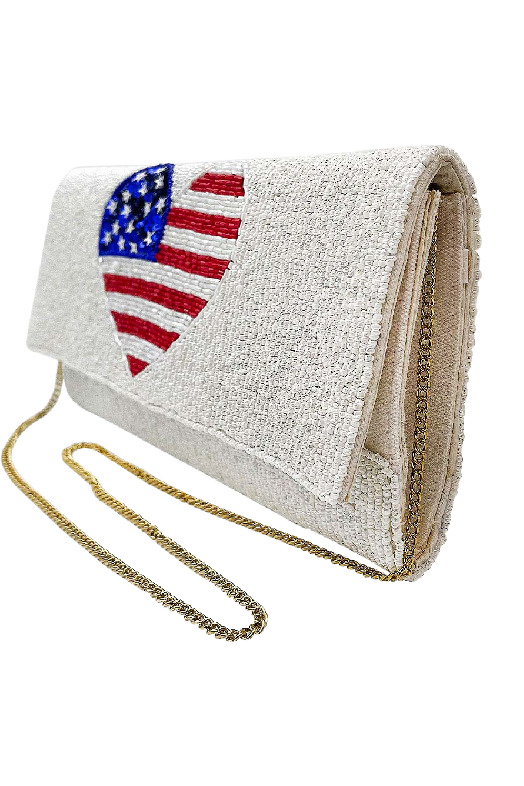 White Beaed Heart / Flag Clutch with Optional Gold Chain