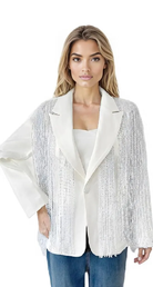 Elevate your wardrobe with this show-stopping blazer featuring a contemporary design that perfectly merges sophistication with a touch of glamour. Crafted in a crisp white hue, this blazer is adorned with cascading silver crystal fringe embellishments, adding an element of dynamic movement and sparkle to your look. Its tailored silhouette includes a sharp lapel collar, single-button closure for a sleek finish, and structured shoulders for a polished appearance. The lightweight fabric ensures comfort while maintaining its chic shape. Perfect for formal events, parties, or nights out, this blazer effortlessly combines elegance and trend-forward style, making it a versatile addition to your wardrobe. Pair it with jeans for a stunning contrast or with tailored trousers for a cohesive, striking statement.
