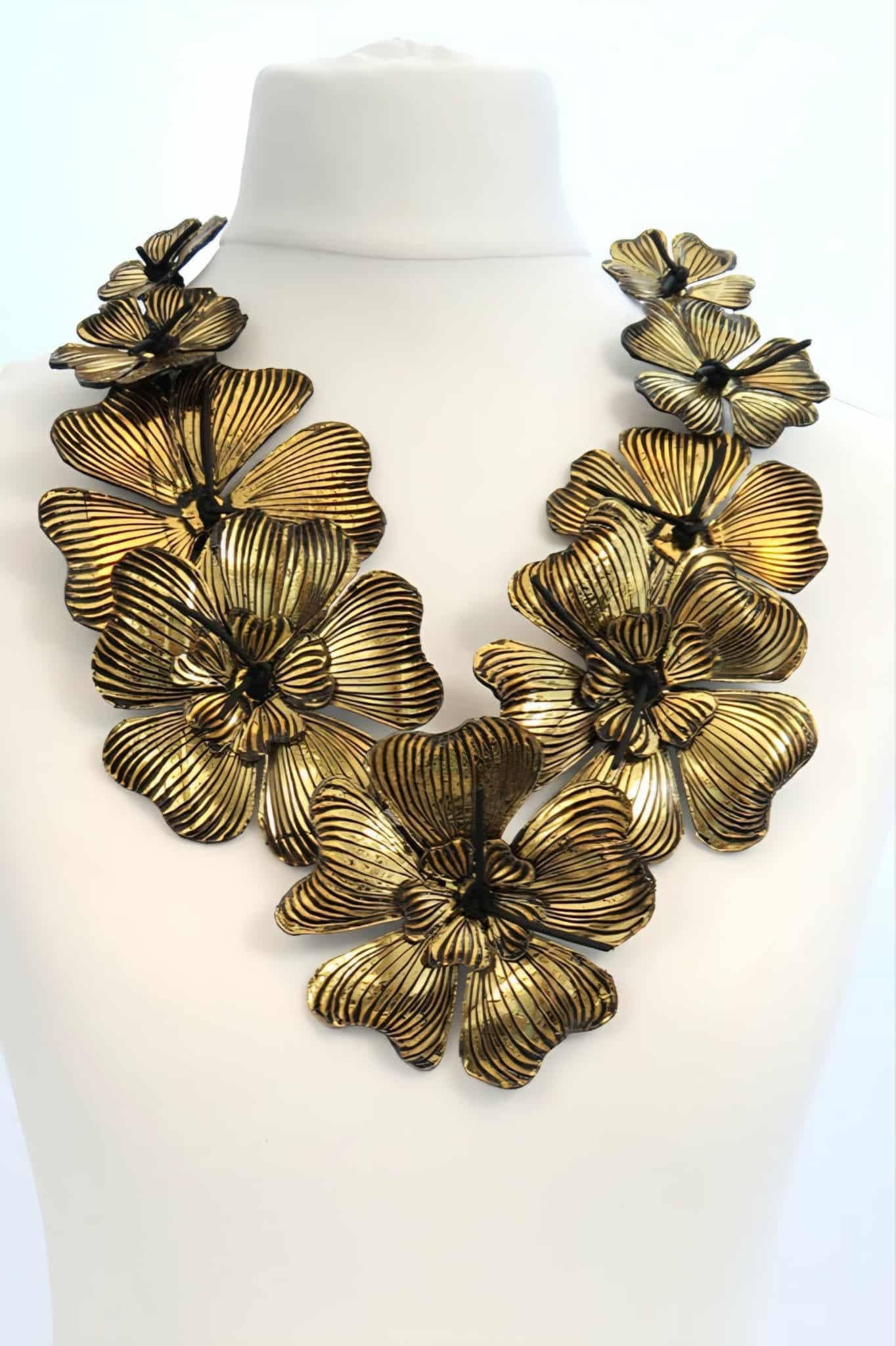 Gold Plumeria Flower Earrings made from recycled plastic water bottles
