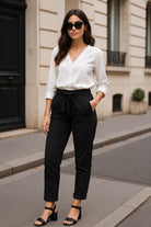 Key Features: Lightweight and breathable fabric Adjustable drawstring waistband Relaxed tapered fit with rolled cuffs Chic black satin side stripe detail Side pockets for convenience Versatile for casual, travel, or weekend wear Easy-care and wrinkle-friendly fabric