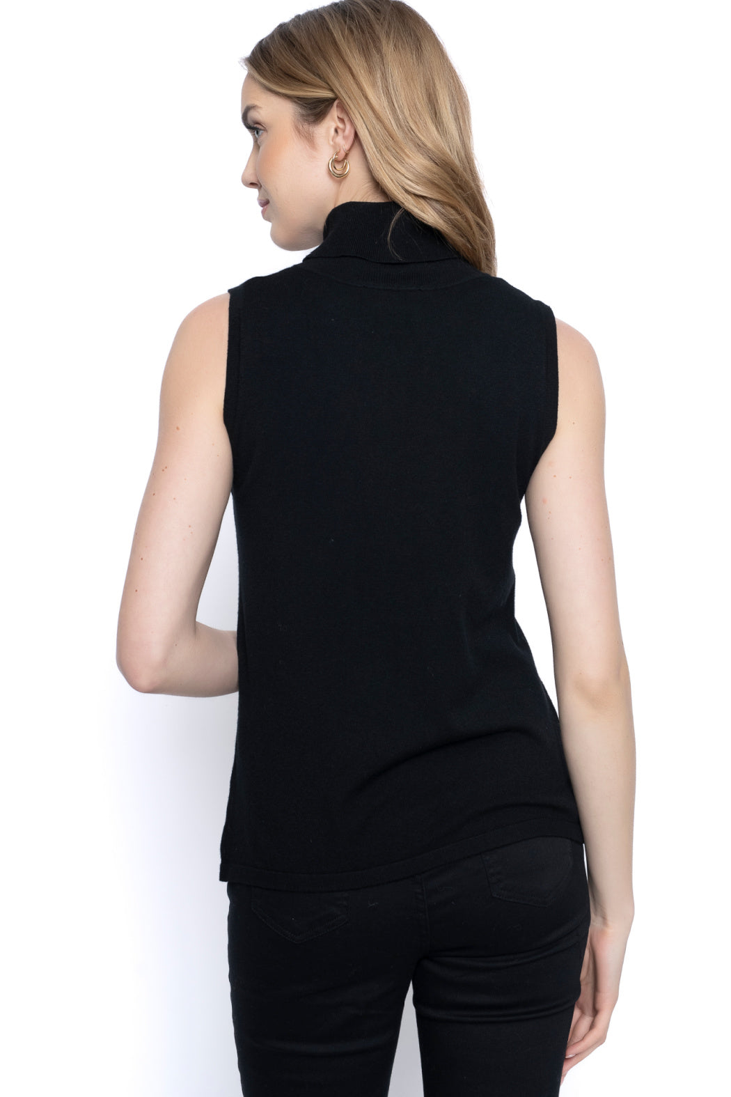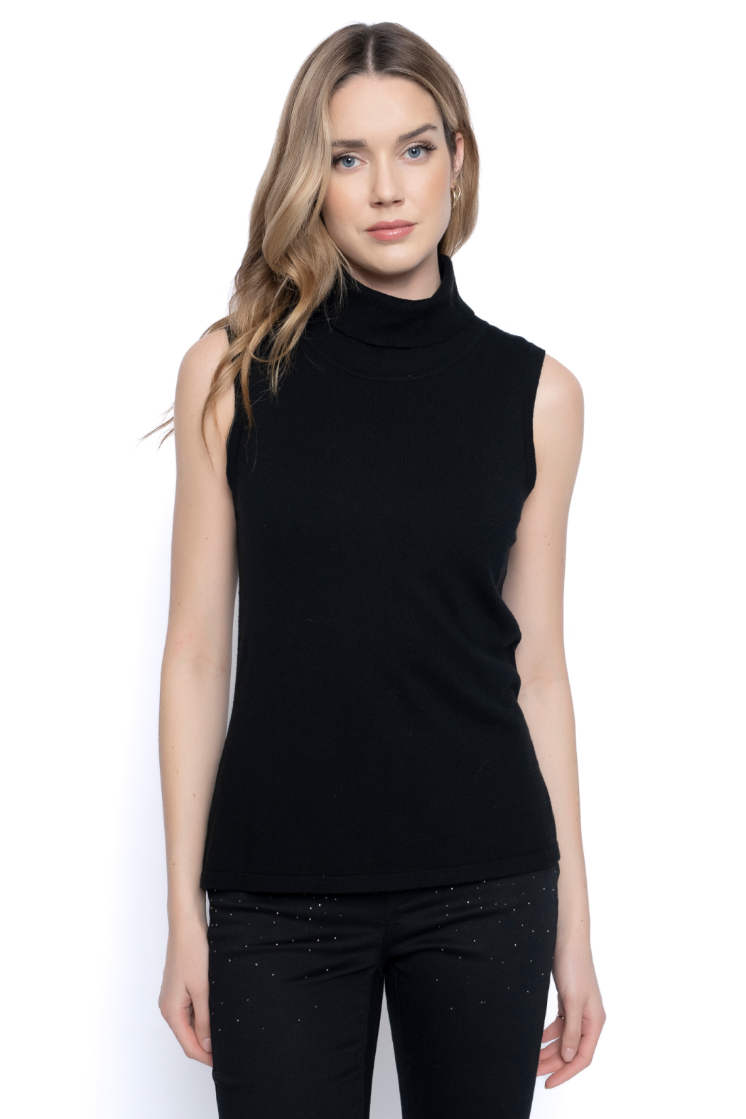 Introducing Our Soft and Chic Sleeveless Black Turtleneck sweater, A Must Have Addition to Any Fashion Forward Wardrobe. This Versatile Top Combines Comfort and Style making it Perfect for Casual and Dressier Occasions. This Sleeveless Sweater Offers a Luxurious Feel Against Your Skin.The Gentle Drape of the Fabric Ensures a Flattering Fit, Providing Comfort and Confidence When Worn. This Timeless Classic Wardrobe Staple Adds a Touch of Elegance and Sophistication to Any Outfit. Whether You are Pairing it With Jeans, Tailored Pants or a Sequin Skirt this Sweater Will Be the Perfect Match. The Sleevesless Design Makes it Easy for Layering, Making it Perfect for Tansistioning Between Seasons. Wear it on its Own on Warmer Days and Layer it Under a Jacket or Blazers when Temperatures Drop.