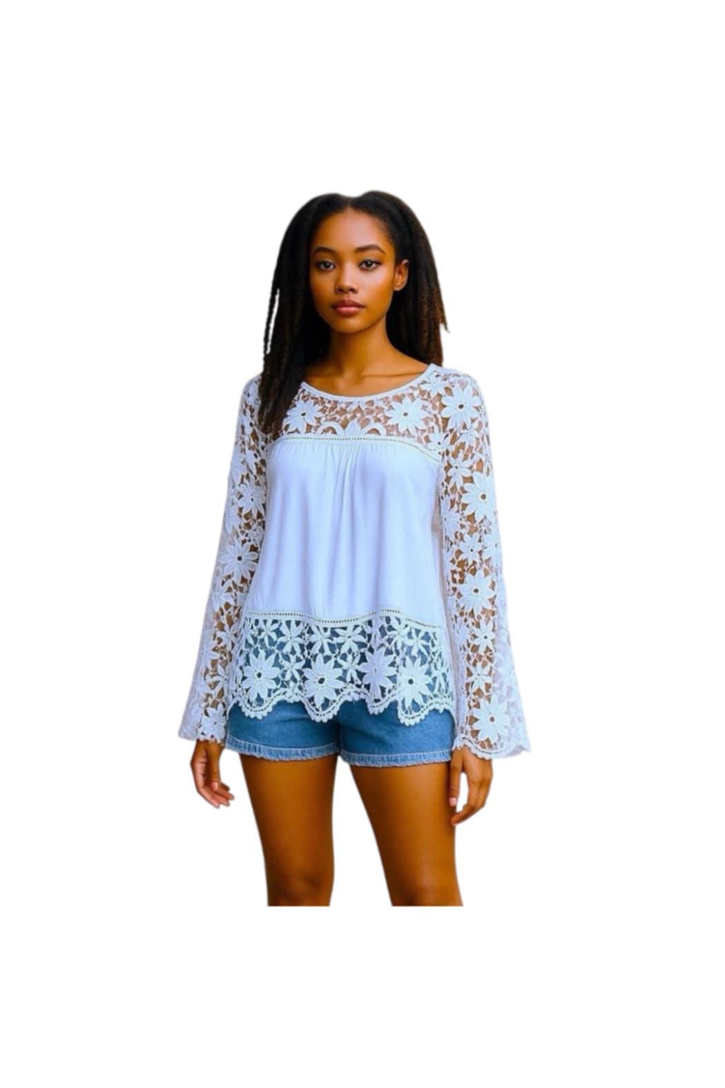 Fashion on Earth Will Elevate your wardrobe with this chic white powder blue blouse, designed for modern elegance and effortless comfort. Featuring intricate floral lace detailing on the long sleeves, yoke, and hem, this top brings a fresh, feminine touch to any look. The relaxed fit and lightweight fabric provide breathability and all-day comfort, perfect for warm-weather occasions or casual outings. The round neckline and scalloped hemline add an extra layer of sophistication, making this blouse a versatile staple that pairs beautifully with jeans, shorts, or skirts. Ideal for both casual and dressy settings, this piece promises easy style and standout charm. Blouse Runs Small