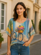 --- Key Features: Lightweight and breathable open-knit fabric Artistic bicycle and floral basket print Dolman sleeves for relaxed fit and easy movement Wide scoop neckline Hip-length silhouette ideal for pants or shorts Soft tones with a bold centerpiece graphic --- Perfect For: Travel, spring layering, creative casualwear, outdoor café looks, weekend strolls, and artful wardrobe expressions.