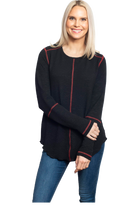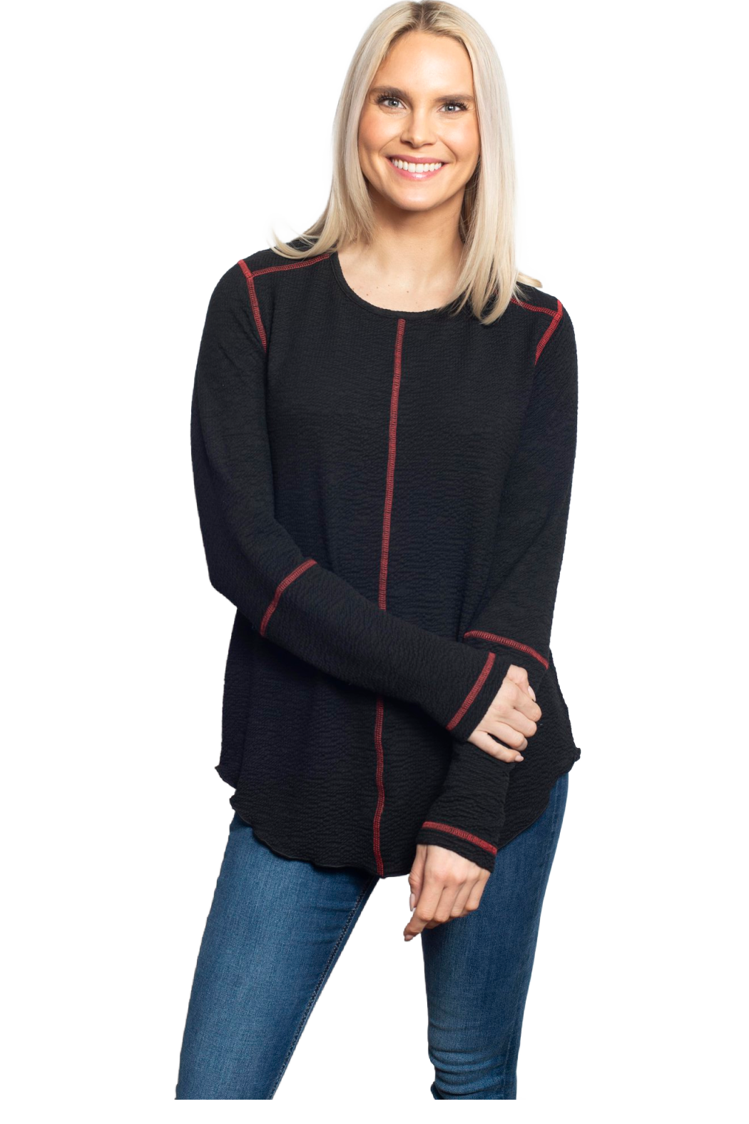 We are Loving Our Black Cozy Waffle Knit Tunic With Red Top Stitching. This Versatile and Stylish Tunic is a Must have Addition To Your Wardrobe. Crafted From a High Quality Waffle Knit Fabric, it Offers a Comfortable Fit and a Touch of Texture. The Black Color Provides Timeless Appeal, While the Red Top Stitching Adds a Pop of Color and Visual Interest. It Pairs Perfectly with Black Slacks or with Jeans, It Exudes a Chic and Sophosticated Vibe. Shop Now and Expirience the Comfort and Style of Our Premium Sno Skins Made in the USA Collection.