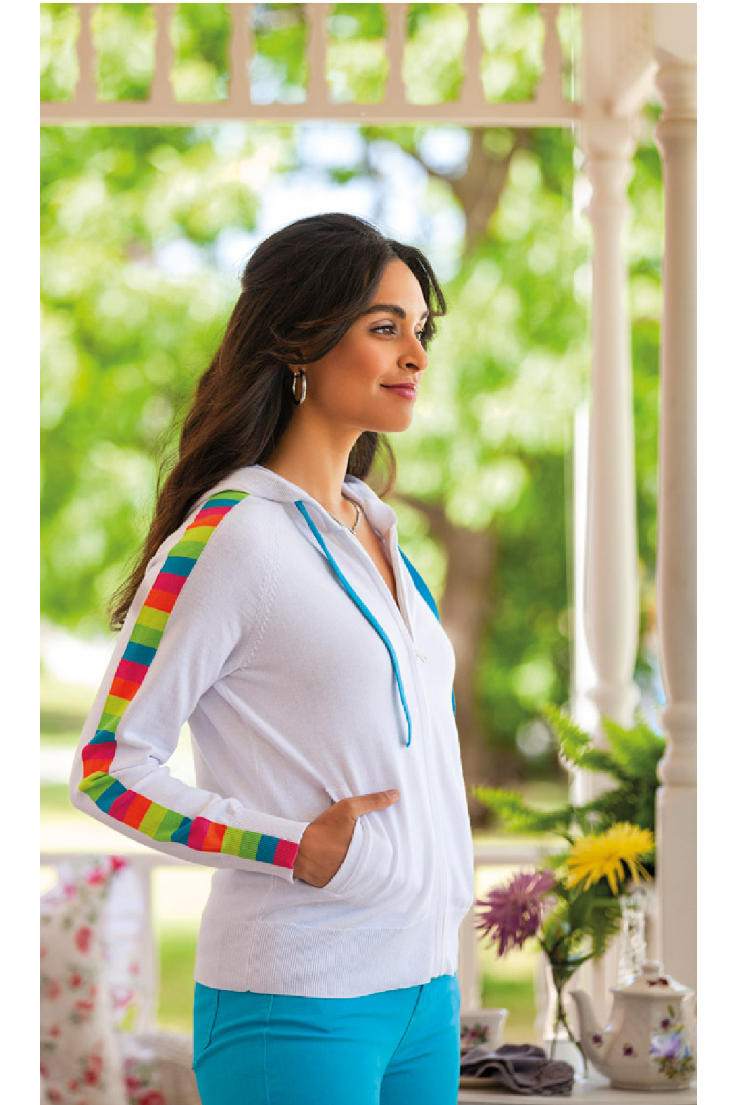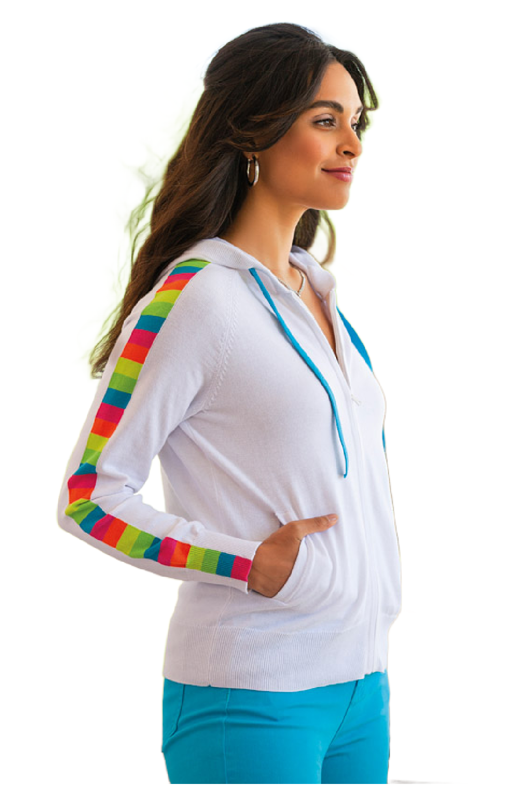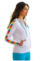 This vibrant and stylish women's hoodie is designed for those who love to add a splash of color to their wardrobe. Crafted from high-quality, soft fabric, it offers exceptional comfort and durability. The striking feature of this piece is the rainbow-striped pattern that adorns the sleeves, running from shoulder to wrist, adding a playful and lively touch to the otherwise classic white color. Featuring a functional front zipper, this hoodie allows for easy wear and versatility in styling. The hood is equipped with contrasting blue drawstrings, providing an adjustable fit for added comfort and style. Pockets are conveniently placed on each side, offering practicality along with a casual, relaxed vibe. Perfect for everyday wear, this hoodie pairs effortlessly with jeans, leggings, or joggers. Whether you're running errands, hitting the gym, or lounging at home, this hoodie promises to keep you cozy and chic. Elevate your casual wardrobe with this must-have hoodie that balances practicality with standout design. Ideal for gifting or treating yourself, it’s a piece that blends functionality with a vibrant, unique style. Proudly Designed in Canada by Elena Wang!