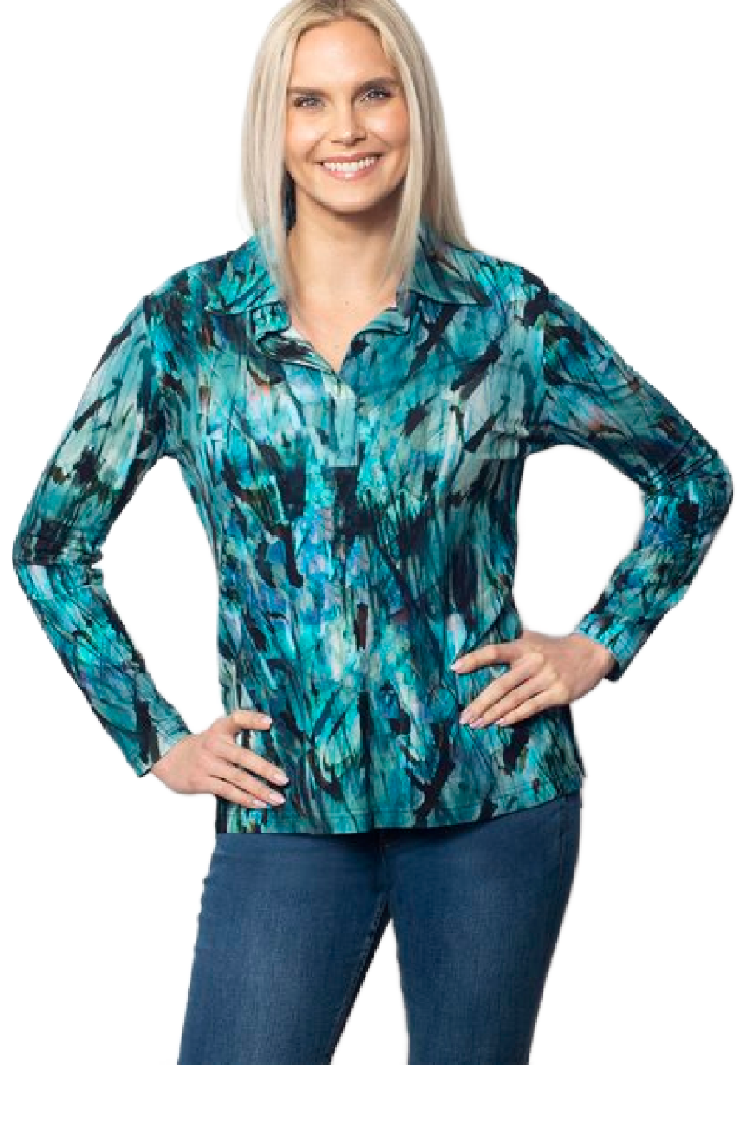 Introducing our vibrant watercolor-inspired long-sleeve top, perfect for adding a splash of color to your wardrobe. This top features a mesmerizing abstract print in shades of blue and green, reminiscent of a serene ocean landscape, making it a standout piece for any casual or work setting. Crafted from a soft, breathable fabric blend, this top ensures all-day comfort and ease of movement. The classic collar and buttoned placket add a touch of elegance, elevating the overall design. The tailored fit flatters the silhouette, while the long sleeves provide versatility for layering or wearing on its own. Ideal for pairing with jeans or dress pants, this top is a versatile addition to any closet. Whether you're heading to the office or a casual brunch, its unique design and comfortable fit make it a go-to choice. Embrace effortless style with this chic, artistic top.