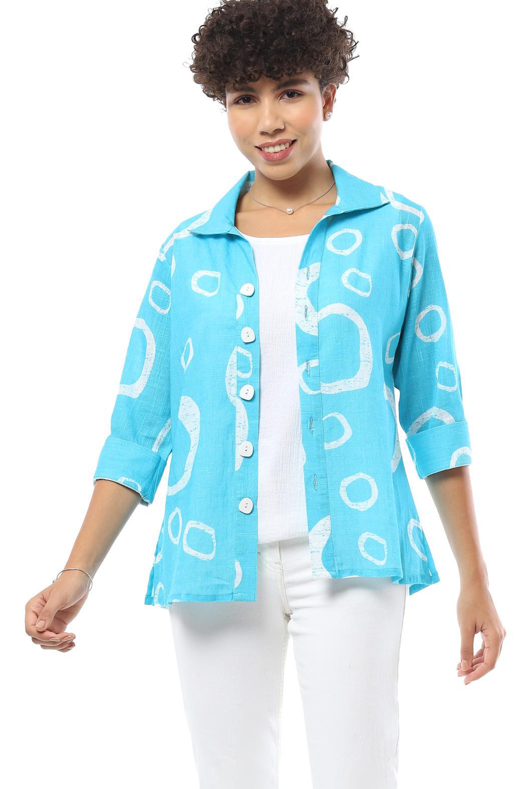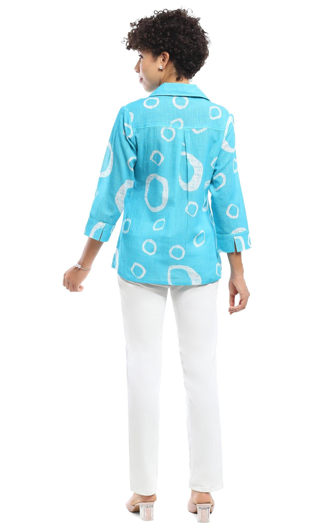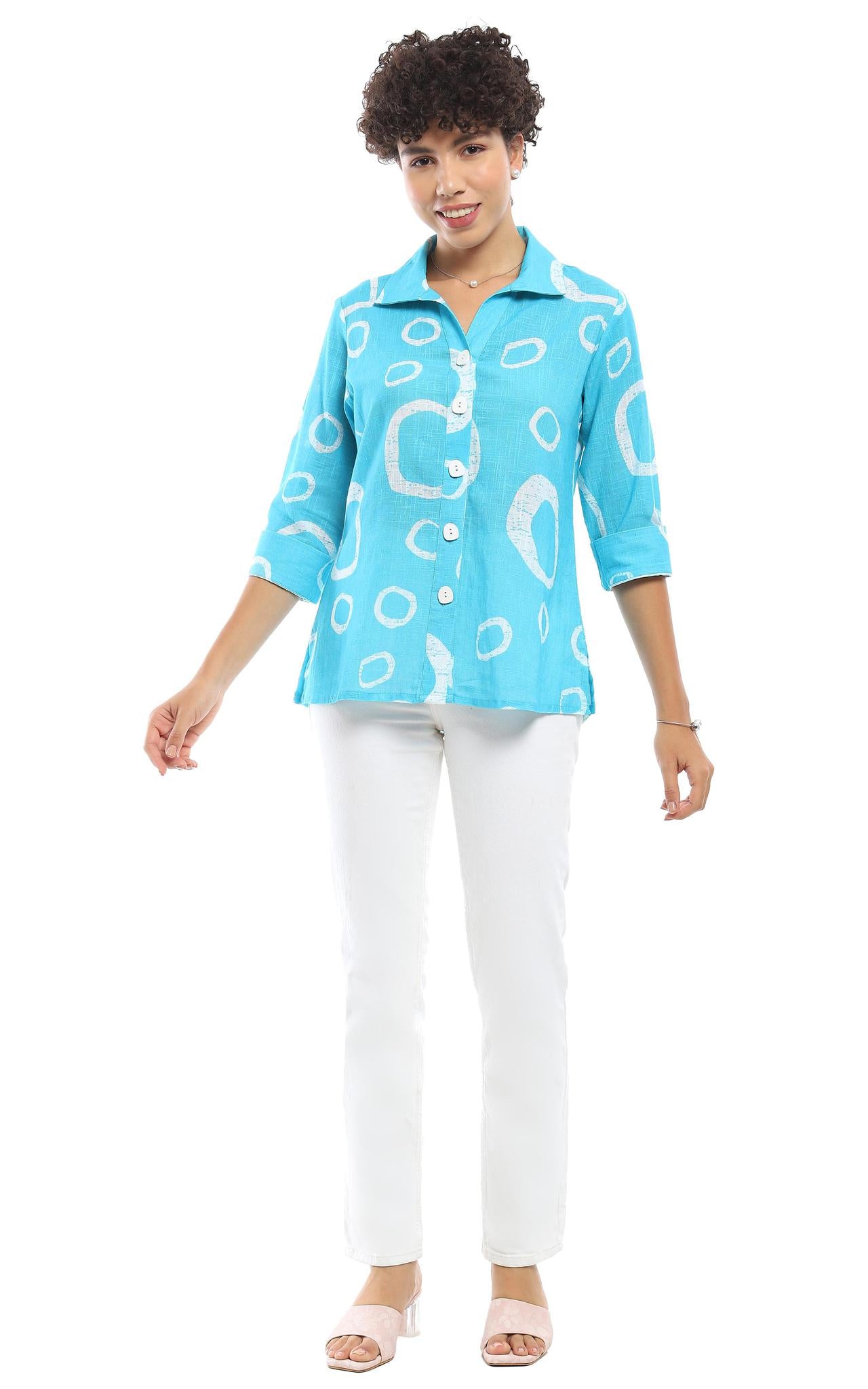 This stylish button-up shirt is a versatile wardrobe essential, perfect for casual outings or layering over outfits. Made from lightweight and breathable fabric, it offers all-day comfort while keeping you effortlessly chic. The vibrant turquoise color is complemented by a bold abstract white print, adding a contemporary flair to your look. Designed with a relaxed fit, this shirt features a classic spread collar and three-quarter roll-up sleeves for a laid-back yet polished appearance. The front button closure allows for easy wear, and the slightly flared hem enhances mobility and comfort. Perfect for pairing with white jeans or shorts, this shirt is an excellent choice for warm-weather styling. Whether worn as a standalone piece or layered over a camisole, this shirt effortlessly combines fashion and functionality.