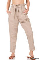 Elevate your wardrobe with these stylish Zenana high-waisted paper-bag pants, crafted from a beige cotton fabric. Featuring a flattering paper-bag waist with a gathered elastic band, these pants offer a modern silhouette and comfortable fit. The adjustable waist tie and front button closure provide customizable wear, while the pleated front detail and tapered leg design add a touch of sophistication. Side pockets offer practical convenience for daily essentials, making these pants perfect for both casual outings and dressed-up occasions. Pair them effortlessly with your favorite tops and sandals for a chic everyday look.