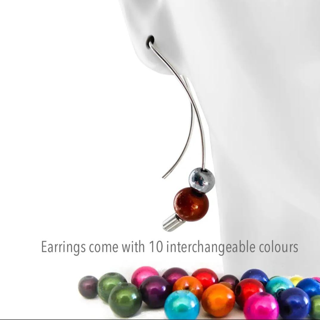 Bead Stackers Earrings comes with 10 interchangeable and stackable beads. Earrings measure 1 3/4" in length. Wires are designed using Canadian refined nickel-free Sterling Silver. They're great for travel, gift giving and all seasons.