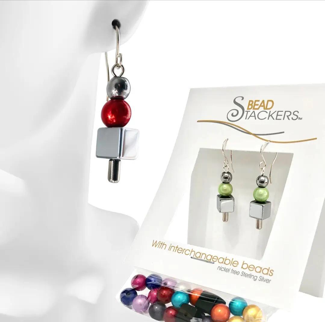 Bead Stacker Earrings are the Perfect Travel Accessory. Earrings include black cube beads and come with 10 moon glow colours. Rubber backs are also included. Earrings measure 1 1/4" from the top of the fish hook to the end. Wires are designed using Canadian refined nickel-free Sterling Silver.