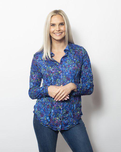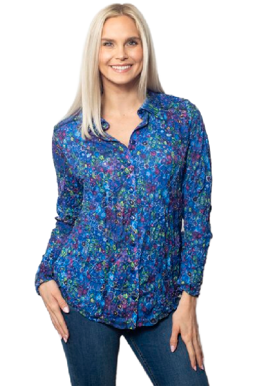 Introducing our vibrant floral button-up crinkle blouse, a striking addition to any wardrobe. Crafted from a lightweight travel friendly fabric, this blouse ensures all-day comfort and style. The dynamic blue base is adorned with a multicolor floral print that exudes a playful yet sophisticated charm. *Key Features: * - *Stylish Design: * Features a classic collar and button-up front, offering a timeless silhouette with a modern twist. - *Dynamic Print: * The captivating floral pattern adds a burst of color, perfect for making a statement. - *Comfortable Fit: * Designed with a relaxed fit, catering to comfort without compromising on style. - *Versatile Styling: * Easily pairs with jeans for a casual look or dress pants for a more polished ensemble. - *Premium Quality: * Made with high-quality materials for durability and easy care. Elevate your style with this must-have piece that effortlessly transitions from day to night. Ideal for both work and leisure, this blouse is the perfect blend of function and fashion. This is a wash and wear blouse. It is perfect for travel!