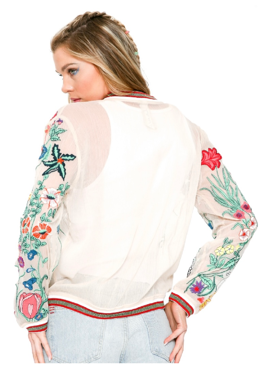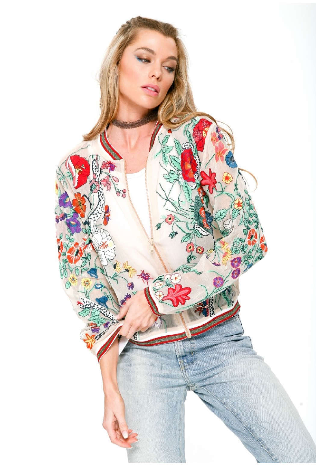 Elevate your wardrobe with this exquisite floral embroidered bomber jacket, a perfect blend of modern style and intricate craftsmanship. Designed with an eye-catching array of colorful floral patterns, this jacket adds a vibrant touch to any outfit. The lightweight, sheer fabric ensures both comfort and breathability, making it a versatile piece suitable for all seasons. *Key Features: * - *Intricate Embroidery: * Detailed, multicolored floral and fauna embroidery that exudes elegance and sophistication. - *Premium Fabric: * Crafted from lightweight, sheer material that provides a soft and airy feel. - *Versatile Design: * A stylish bomber silhouette that pairs effortlessly with both casual and semi-formal outfits. - *Quality Zipper Closure: * Featuring a durable, smooth-running front zipper that enhances functionality. - *Ribbed Trims: * Accentuated with contrasting ribbed collar, cuffs, and hem for added style and comfort. *Benefits: * - *Style Statement: * Ideal for making a bold fashion statement, be it for a casual outing or a special occasion. - *Comfort: * The breathable fabric ensures a comfortable wear throughout the day. - *Multi-season Wear: * Suitable for layering during cooler months or as a standalone piece in warmer weather. *Functionality: * - *Easy to Wear: * The front zipper closure allows for quick and easy draping. - *Perfect Fit: * Ribbed trims ensure a snug yet comfortable fit at the wrist and waist. *Design: * - *Vibrant Colors: * The vibrant floral embroidery stands out beautifully against the sheer backdrop. - *Casual to Chic: * Versatile enough to be paired with jeans, skirts, or dresses for a chic, polished look. Reinvent your style with this unique floral embroidered bomber jacket. Perfect for those who wish to add a splash of color and a touch of elegance to their apparel.