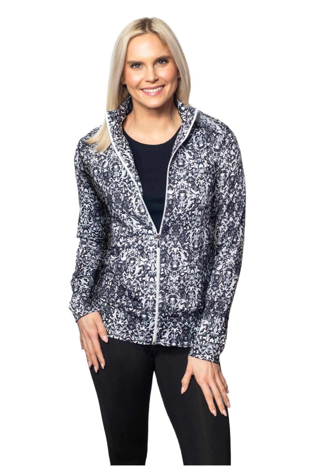 Black and White Printed Scuba Fabric Jacket with Rear Zip Pocket....Perfect for Every Day! Proudly Made in The USA by Sno Skins