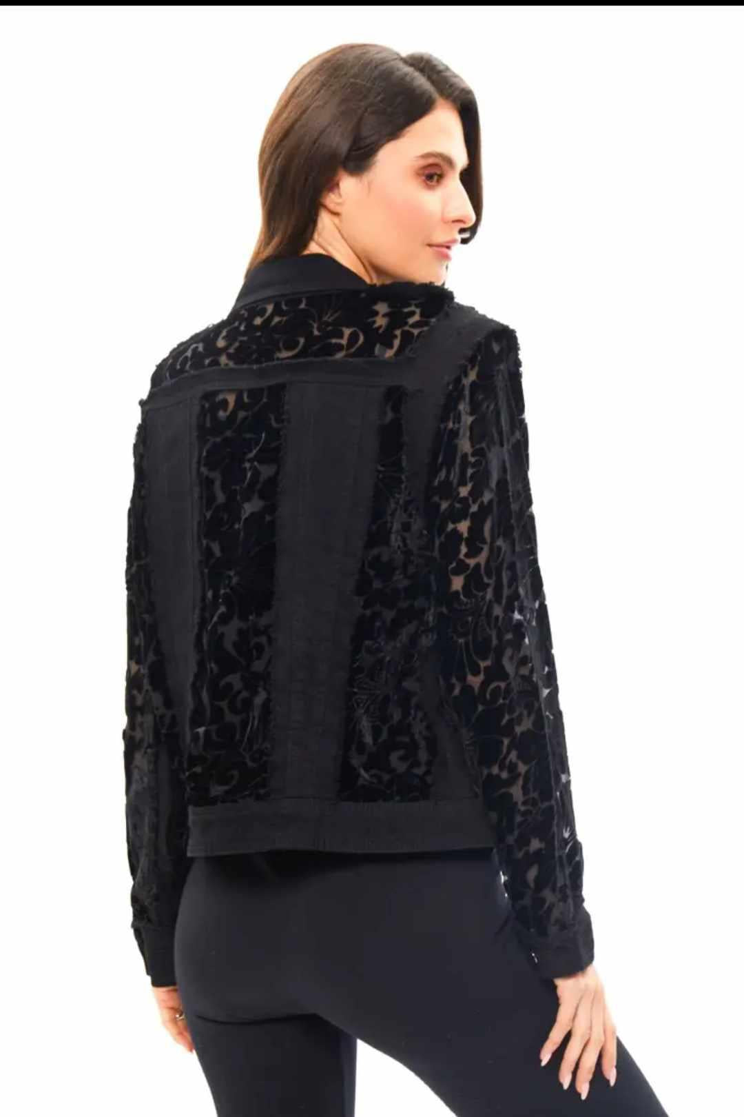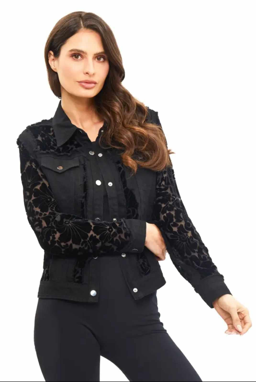 Elevate your wardrobe with this chic and versatile black jacket, featuring a stunning blend of textures and patterns. The jacket stands out with its intricate floral burnout velvet sleeves, adding a sophisticated and feminine touch to its edgy denim-inspired design. The structured silhouette includes classic details like front chest pockets, button closures, and a collar, ensuring both style and functionality. Perfect for layering, this jacket effortlessly transitions from casual daytime looks to evening ensembles. Whether paired with jeans or sleek trousers, it’s a standout piece that combines comfort and elegance for any occasion.