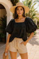 Elevate your resort-chic wardrobe with our Black Check Puff Sleeve Square Neck Blouse, a timeless piece blending effortless elegance with modern style. Designed in a subtle checkered texture, this blouse features statement puff sleeves with elastic cuffs, a flattering square neckline, and a relaxed silhouette that drapes beautifully. Perfect for pairing with linen shorts, jeans, or skirts, it transitions seamlessly from sunny daytime strolls to sophisticated evening outings.