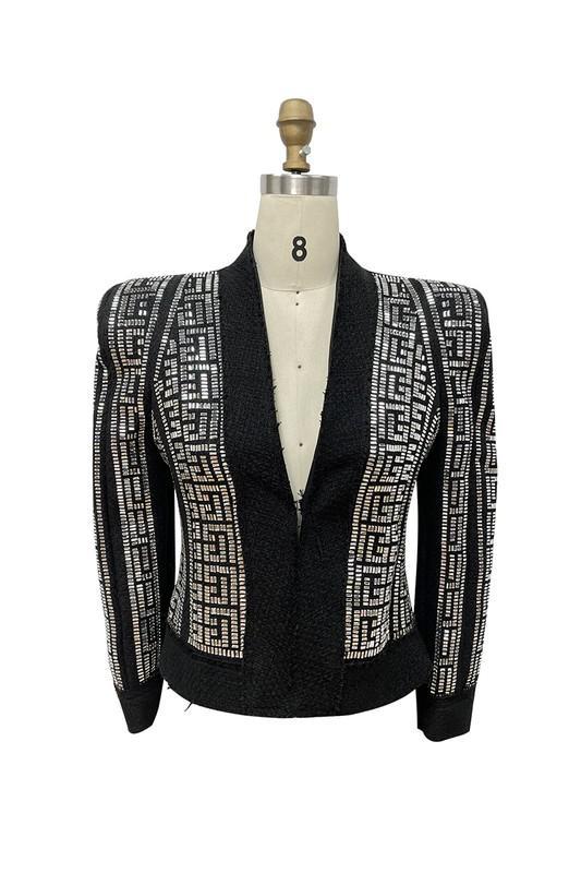 Elevate your wardrobe with this stunning black boucle embellished jacket, perfect for adding a touch of glamour to any outfit. This chic piece features intricate beaded detailing along the sleeves and front, creating a captivating geometric pattern that exudes sophistication and style. Crafted from high-quality materials, it offers a comfortable fit while maintaining a structured silhouette. Key features include shoulder pads for a fashionable edge, raw edges and an open-front design that adds versatility to your ensemble. Pair it with a sleek top and high-waisted jeans for a contemporary look or wear it over a dress for evening elegance. Ideal for special occasions or making a statement in everyday fashion, this jacket is a must-have addition to your closet.