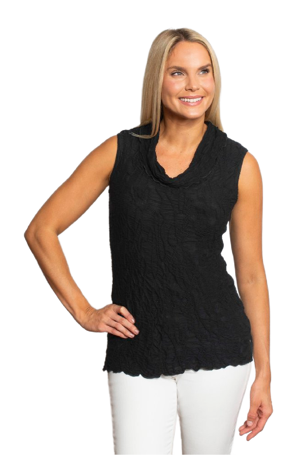This elegant sleeveless top combines comfort and style, making it a versatile addition to your wardrobe. Crafted from a soft, textured fabric, it features a subtle crinkled design that adds depth and character. The cowl neckline creates a sophisticated touch, while the sleeveless cut offers freedom of movement and the perfect opportunity to layer or wear on its own during warmer seasons. Designed in classic black, this top easily pairs with pants, skirts, or jeans for both casual and dressier occasions. Its lightweight and breathable material ensures all-day comfort. A must-have for effortless, chic styling.