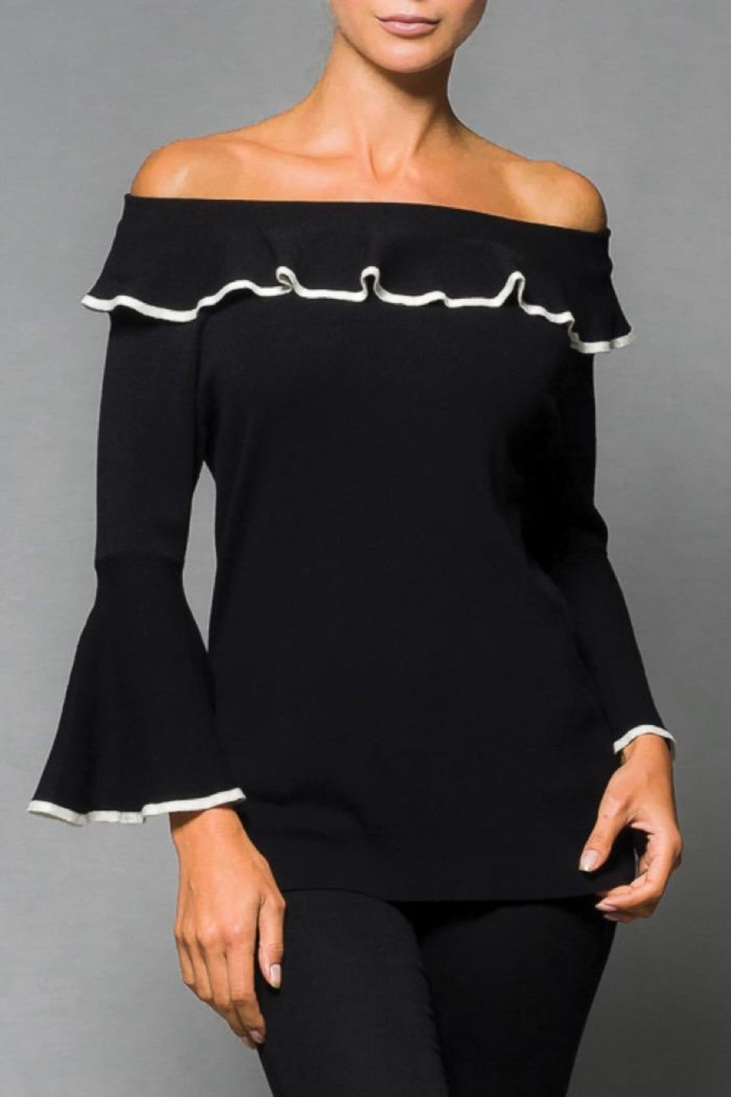 This black knit sweater has a white ruffle collar and bell sleeves that are trimmed with white accent. This sweater can also be worn off the shoulder. Hand Wash/Cold Water.