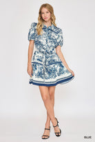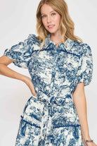 Key Features: Blue and ivory toile print, Short puff sleeves, Button-front bodice, Adjustable self-tie waist for a flattering fit, Flared skirt with movement, Lightweight fabric, Resort-ready and travel friendly