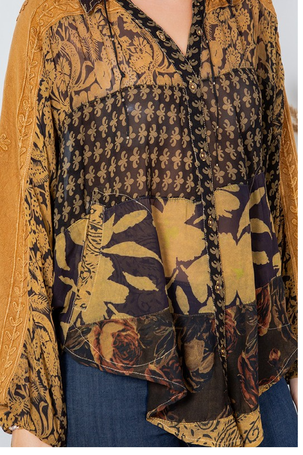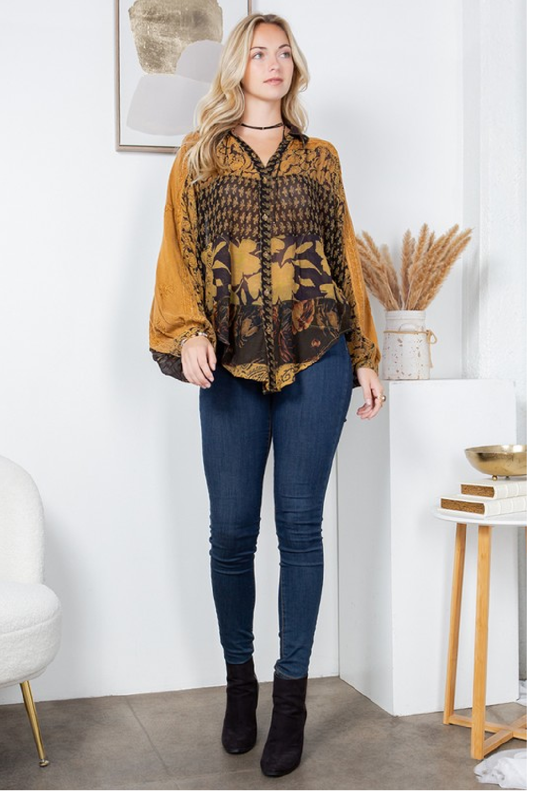 Illuminate your wardrobe with our Ethereal Patchwork Boho Blouse with Balloon Sleeves, a stellar blend of style and comfort, perfect for any occasion. This enchanting blouse features a vibrant tapestry of intricate patterns in warm, earthy tones that exude a bohemian charm. Key Features: - *Patchwork Design*: A unique blend of diverse patterns and vibrant colors, creating a visually appealing statement piece. - *Comfort Fit*: Designed with a relaxed, flowy silhouette that offers both elegance and ease of movement. - *Versatile Styling*: Perfect for pairing with your favorite jeans, skirts, or leggings for an effortlessly chic look. - *Long Sleeves*: Provides a modest yet stylish coverage, ideal for transitioning between seasons. - *Lightweight Fabric*: Made from premium, lightweight materials ensuring comfort all day long. Embrace your inner free spirit with this stunning boho blouse and make a bold statement wherever you go. With its distinctive patchwork design and flattering fit, it is a must-have addition to every fashion-forward wardrobe.