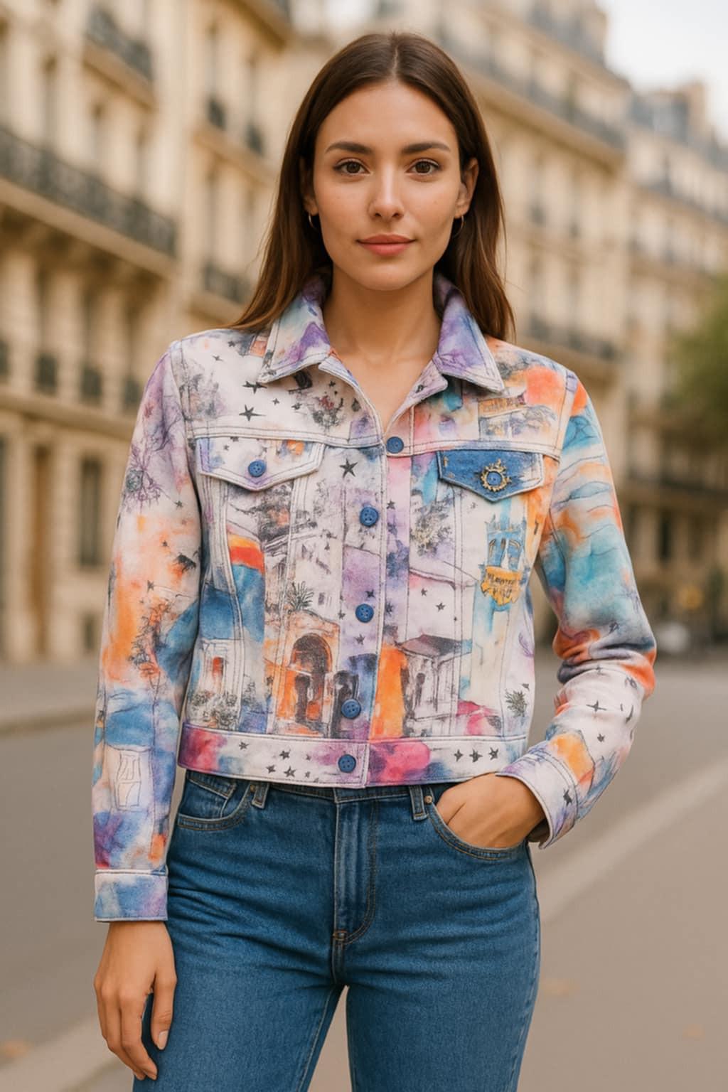 Key Features: Made in Canada by Michael Tyler Knit fabric with a denim jacket silhouette Vibrant abstract cityscape and watercolor print Lightweight, breathable, and ideal for layering Button-front closure with chest flap pockets Structured collar and cuff detailing Travel-friendly and wrinkle-resistant Perfect for resort wear, city strolls, or statement styling