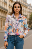 Make a bold fashion statement with this vibrant knit jacket by Michael Tyler, proudly made in Canada. This eye-catching jacket blends the comfort of knitwear with the structured look of denim, featuring a stunning abstract cityscape print in watercolor tones of blue, lavender, orange, and pink. With classic denim details like button-flap chest pockets, a structured collar, and full front buttons, this piece is a standout layering essential. Lightweight and travel-friendly, it pairs effortlessly with jeans, skirts, or wide-leg pants for a chic, artsy vibe that transitions seamlessly from day to night.