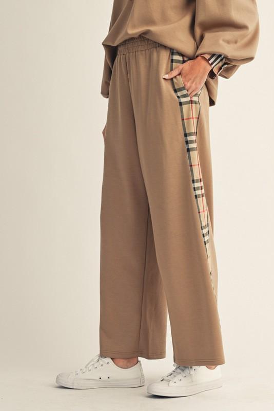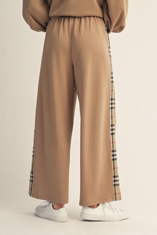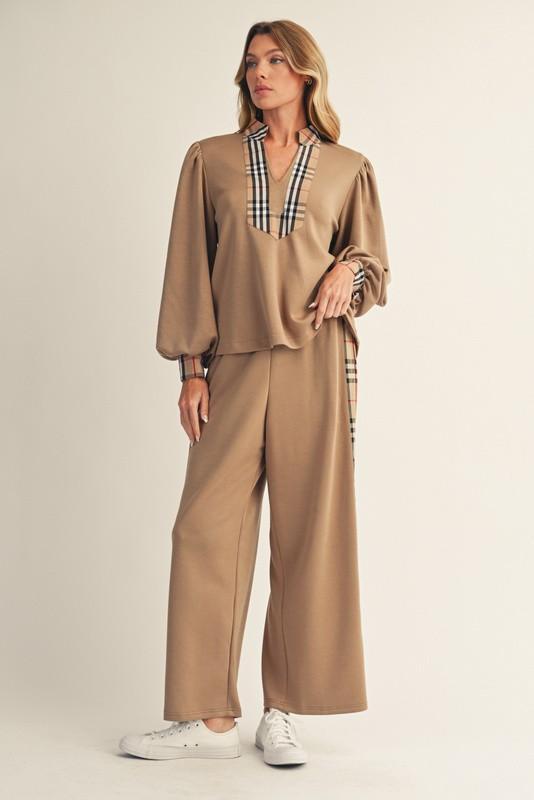 Camel Plaid Trim Knit Top & Wide-Leg Pant Set