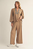 Key Features Two-piece matching knit set Soft camel knit fabric V-neck top with plaid trim detail Long sleeves with subtle volume Wide-leg, pull-on pants Relaxed yet polished fit Lightweight and comfortable