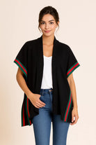 Elevate your layering game with this chic black knit ruana by Top it Off, a must-have for transitional weather and year-round style. Crafted from soft, medium-weight knit fabric, this open-front cape drapes effortlessly over your shoulders, offering both warmth and elegance. Featuring vibrant green and red stripe detailing along the edges and sleeves, this ruana adds a pop of color and designer-inspired flair to any outfit. Side button accents allow for versatile styling—wear it loose, draped, or partially fastened. Perfectly pairs with jeans, leggings, or slim trousers for a polished resort-chic or urban casual look.