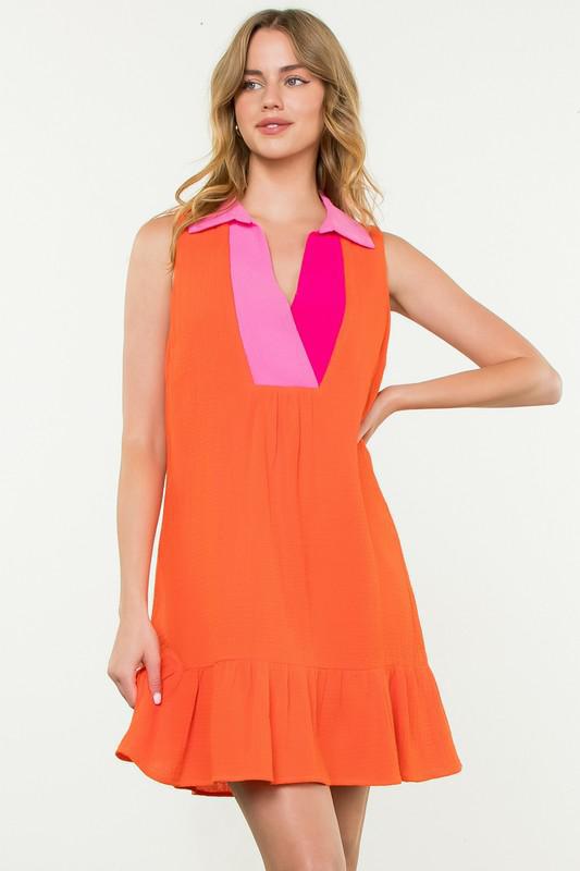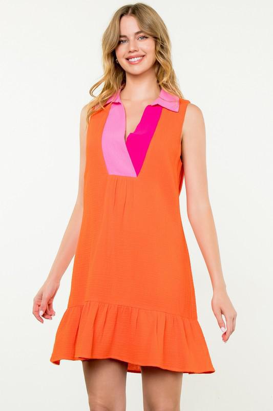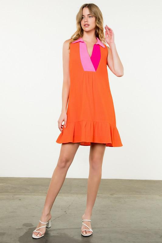 This vibrant sleeveless dress is a bold and stylish choice for any occasion. Designed with a relaxed A-line silhouette, it offers a comfortable yet flattering fit for all body types. The dress features a striking color-blocked collar and deep V-neckline in contrasting shades of pink, adding a pop of playful elegance. The bright orange base exudes confidence and energy, making it perfect for warm-weather outings. A ruffle-tiered hemline adds a feminine touch and enhances movement, while the lightweight fabric ensures all-day comfort. Effortlessly chic, this dress is ideal for casual wear, vacations, or summer gatherings. Pair it with sandals or heels for an easy yet sophisticated look.