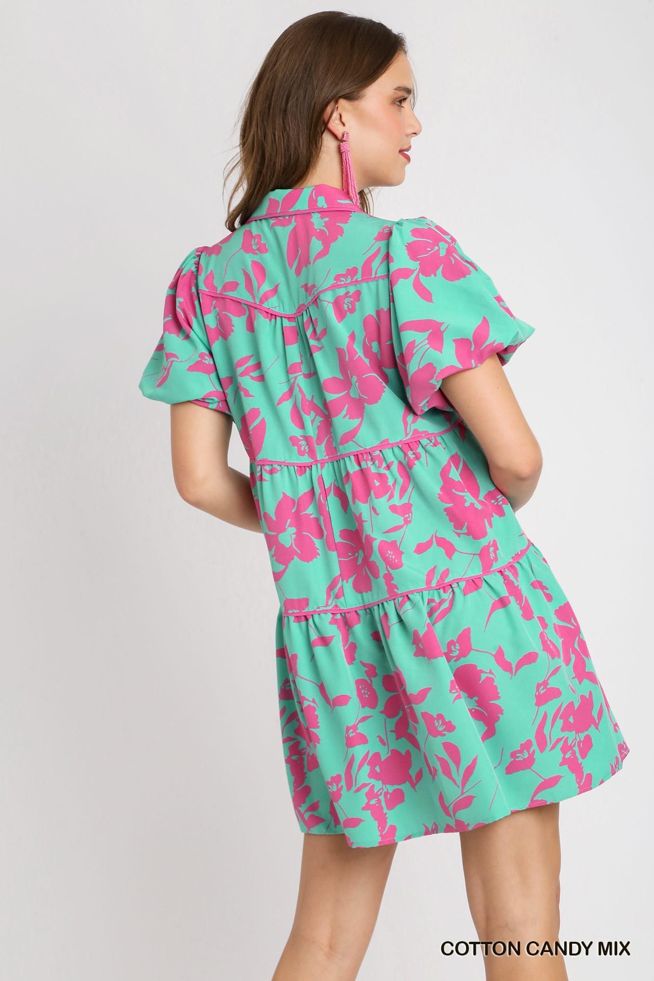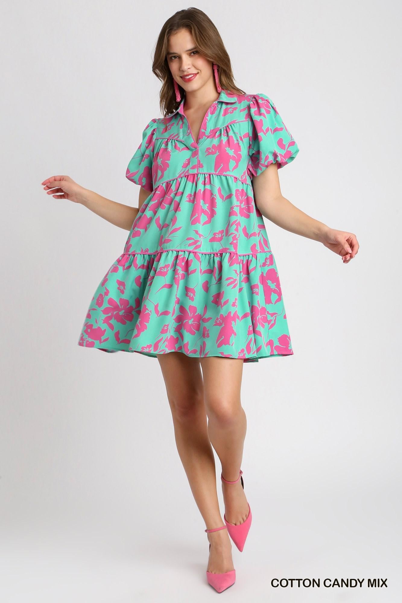 Introducing our vibrant Cotton Candy Mix Babydoll Dress, designed to make a bold statement with its eye-catching pink and green color palette and playful silhouette. This dress features a vivid green turquoise and pink floral pattern, perfect for adding a pop of color to your wardrobe. The loose, tiered design of this baby doll ensures a comfortable and flattering fit, while the puffed sleeves add a touch of elegant detail. Crafted from lightweight fabric, it provides all-day comfort, making it ideal for both casual outings and special occasions. Embrace a fun and stylish look with this must-have dress.