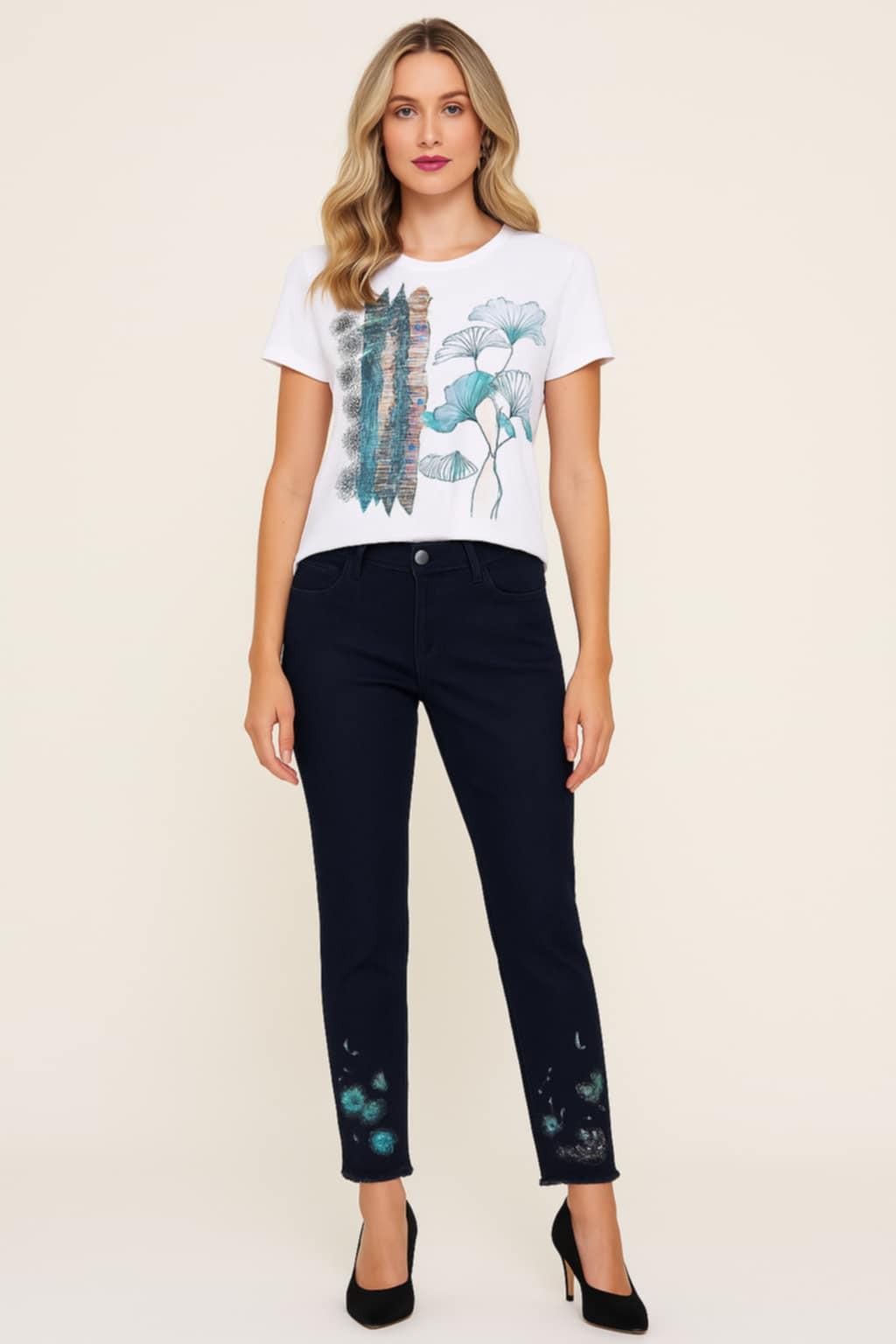 --- Key Features: Dark wash stretch denim for a flattering fit Beautiful floral embroidery at the hem for unique detail Raw edge hem for a trendy, modern look Classic five-pocket styling with zip and button closure Mid-rise waist for comfortable everyday wear Versatile style pairs with tees, blouses, or sweaters