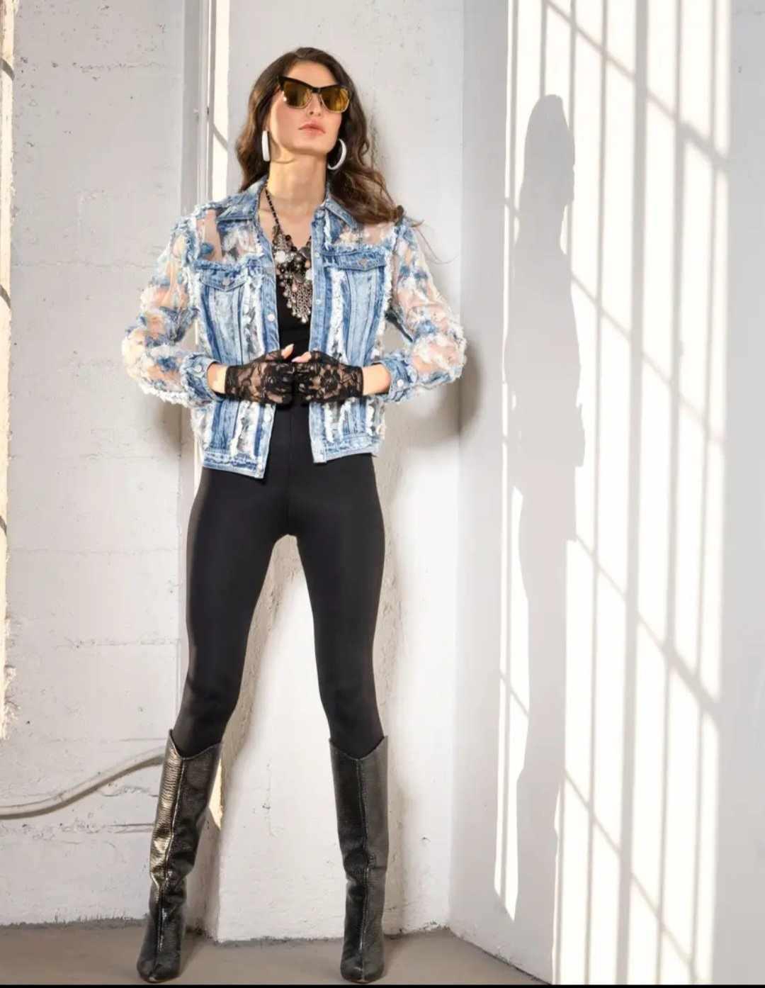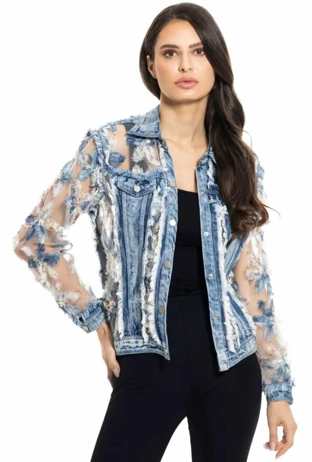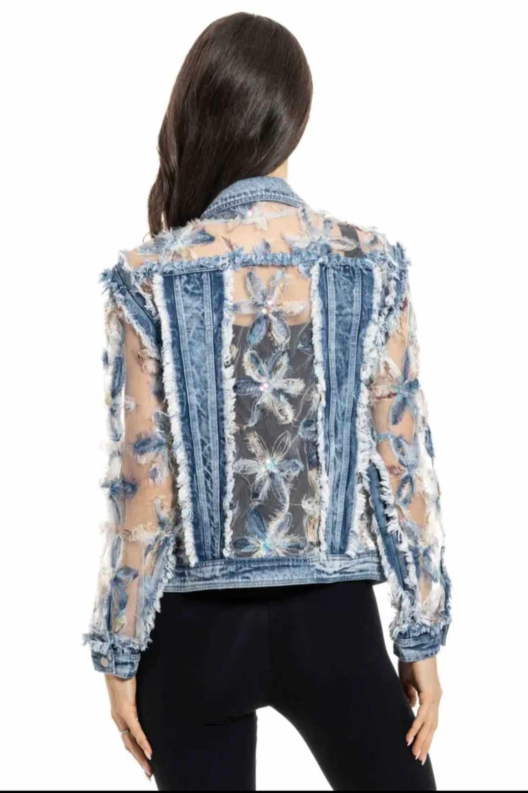 Make a statement this spring and summer with this distressed denim jacket featuring sheer embroidered sleeves. The jacket combines rugged denim with delicate floral embroidery on semi-sheer mesh, creating a perfect blend of edgy and feminine. The frayed detailing on the denim adds texture and character, while the snap-button closures and chest pockets provide classic functionality. Lightweight and breathable, this jacket is a versatile piece for layering and elevating any look with ease.