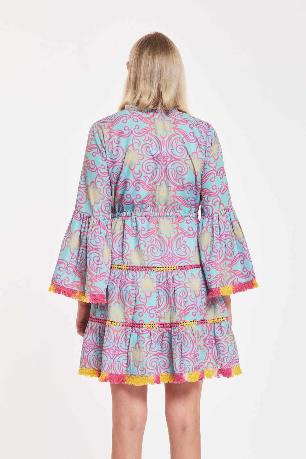 Elevate your wardrobe with our best-selling Desideria dress. The dainty blue and hot pink majolica print draws the eye, while the delicate lace trim and tassel details add a touch of sophistication. The adjustable drawstring creates a flattering, flouncy silhouette that is perfect for any occasion, while bell sleeves add a touch of hippie bohemian flare. Ruffle trim along v neckline