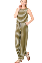 Dusty Olive and Ivory Striped Sleeveless Jumpsuit With Pockets - Elastic Waistband... Total Body Legnth: 20" (TOP), CHEST: 34", INSEAM: 28.5" approx. - MEASURED FROM SMALL * COLOR MAY VARY SLIGHTLY DUE TO MONITOR RESOLUTION