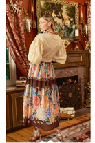 Cotton gold metallic/floral print puff sleeve button-up tiered dress, leopard print contrast collar stand/CF placket/belt, shoulder with floral embroidered trims