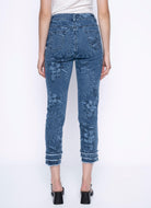 Upgrade your denim collection with these stylish cropped jeans featuring a distinctive floral and abstract laser print design. Crafted from premium-quality stretch denim, these jeans offer exceptional comfort and a flattering fit. The mid-rise waist ensures a perfect balance of support and flexibility, making them ideal for all-day wear. With a classic five-pocket construction and a button-zip closure, these jeans provide both functionality and timeless appeal. The triple-tiered frayed hem gives a modern, edgy finish that adds character to any outfit. Pair them with your favorite tops and footwear for an effortlessly chic look. Perfect for casual outings or dressed-up ensembles, these cropped jeans are a versatile must-have for any wardrobe.