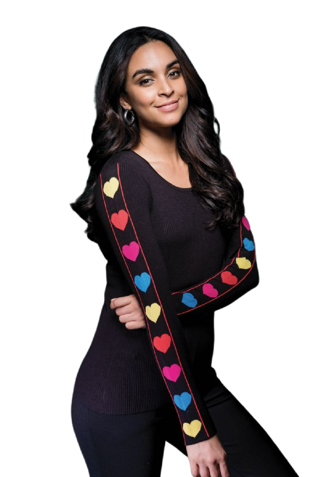 Discover Exceptional Style in this Alison Sheri Women's Black Ribbed Soft Sweater Adorned with a Multi Color Heart Motif Down Each Sleeve. This Fashionable Sweater Combines Comfort and Playfulness, making it a Must Have Addition to Your Wardrobe.