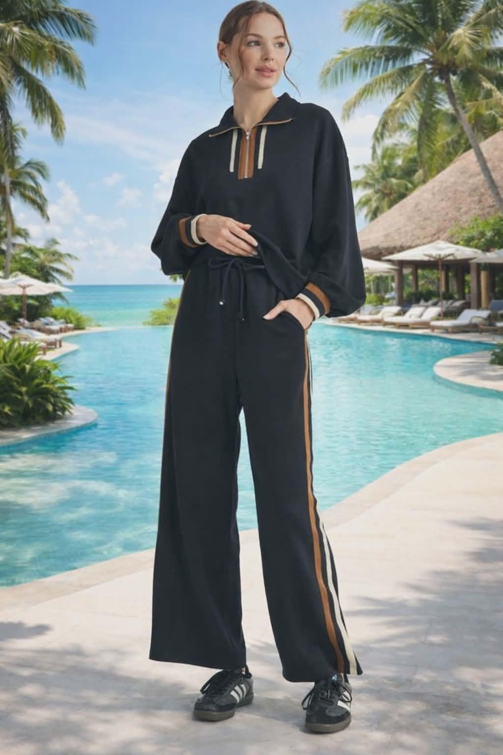 Key Features & Details Two-piece matching knit set Soft, lightweight knit fabric Partial zip pullover top with collar Long sleeves with contrast cuff trim High-rise, wide-leg pants Elastic waist with adjustable drawstring Contrast side stripe detailing Relaxed, flattering fit Resort chic / athleisure inspired style
