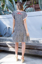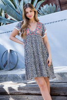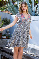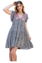 Step into a world of effortless style and bohemian charm with our stunning A-line summer dress. This dress features a dynamic leopard print base, giving it a wild and trendy edge that is beautifully contrasted by the intricate floral embroidery along the neckline and shoulders. The V-neck and short flutter sleeves add a touch of femininity and elegance to its relaxed silhouette, making it perfect for any casual outing or a breezy summer day. Crafted from lightweight, breathable fabric, this dress ensures ultimate comfort while maintaining a chic appearance. The loose, flowy design allows for ease of movement, ideal for keeping cool and stylish on warm days. Accentuating its boho-chic vibe, the flared shape gives it a flattering fit that suits all body types. Key Features: - Bold leopard print with floral embroidery - V-neckline and short flutter sleeves for added femininity - Lightweight fabric for comfort - Flowy A-line silhouette for a flattering fit - Perfect for casual wear or summer outings Elevate your wardrobe with this versatile and eye-catching piece, blending the exotic with the delicate for a unique fashion statement.