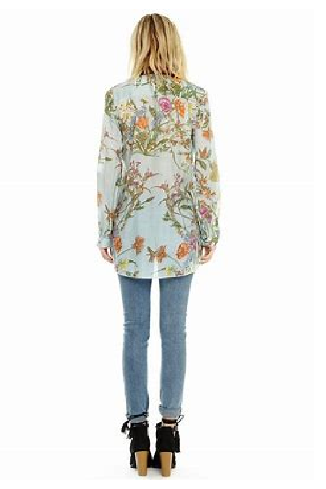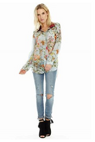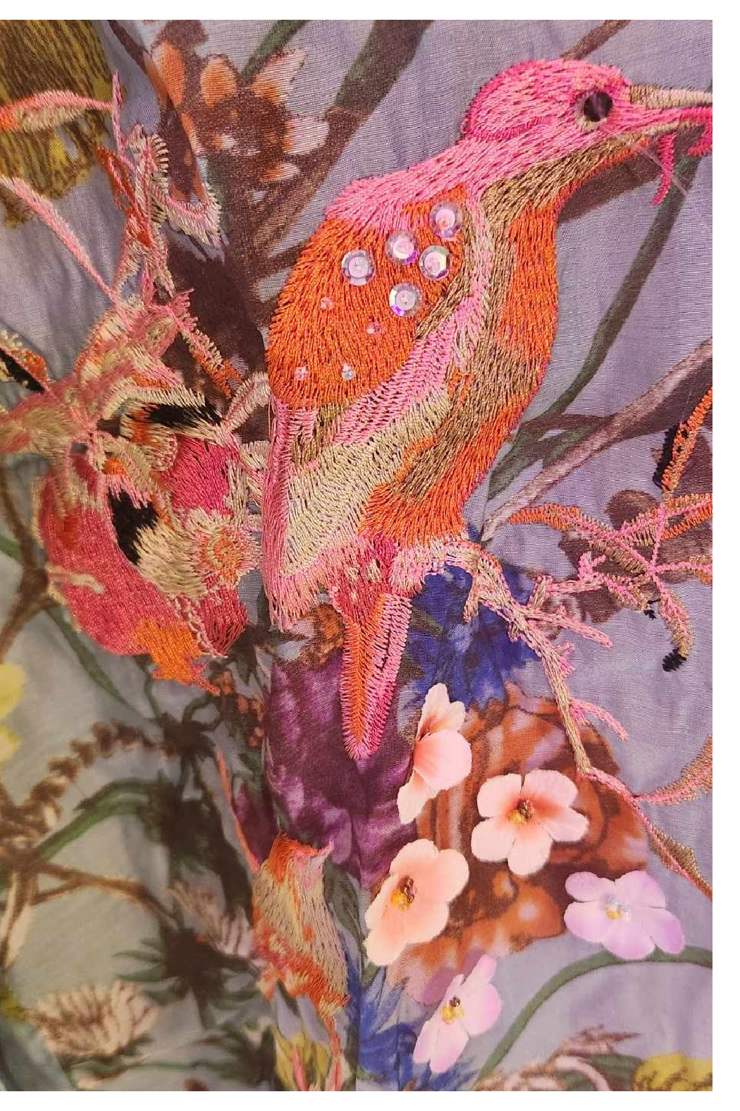 Elevate your wardrobe with this stunning floral embroidered blouse, perfect for adding a touch of elegance and whimsy to any outfit. The blouse features a captivating botanical print with vibrant, detailed embroidery of birds and flowers, bringing a burst of color and life to the design. Crafted from a lightweight, breathable fabric, it ensures comfort and easy wear throughout the day. The blouse is designed with a contrasting plush velvet collar in a rich, rust shade, adding a luxurious touch and creating a sophisticated contrast against the delicate, sheer fabric. The button-down front allows for versatile styling, whether you choose to wear it fully buttoned for a formal look or slightly open for a more relaxed vibe. Key Features: - Intricate floral and bird embroidery - Lightweight, airy fabric for all-day comfort - Luxurious rust-colored velvet collar - Button-down front for versatile styling - Perfect for both casual and formal occasions Indulge in the whimsical charm of this floral embroidered blouse and make a bold fashion statement wherever you go.