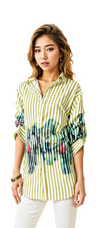 Lime Stripe Graphic Blouse with dramatic pleat accents at the elbow length sleeves, a button up front. It has a longer back hemline, a pleat in back below the shoulders and wavy watercolor stripes throughout. A mod graphic in front depicting urban street life makes it truly unique.