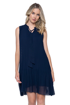 Elevate your wardrobe with this effortlessly chic sleeveless pleated dress. Designed for both comfort and style, this elegant piece features a lightweight, flowy silhouette with delicate pleats for added texture and movement. The classic navy hue makes it a versatile staple, perfect for both daytime outings and evening occasions. A dainty tie neck detail enhances the sophisticated charm, while the breathable fabric ensures all-day comfort. Pair it with heels for a polished look or dress it down with flats for a more relaxed vibe. A must-have for any modern wardrobe.