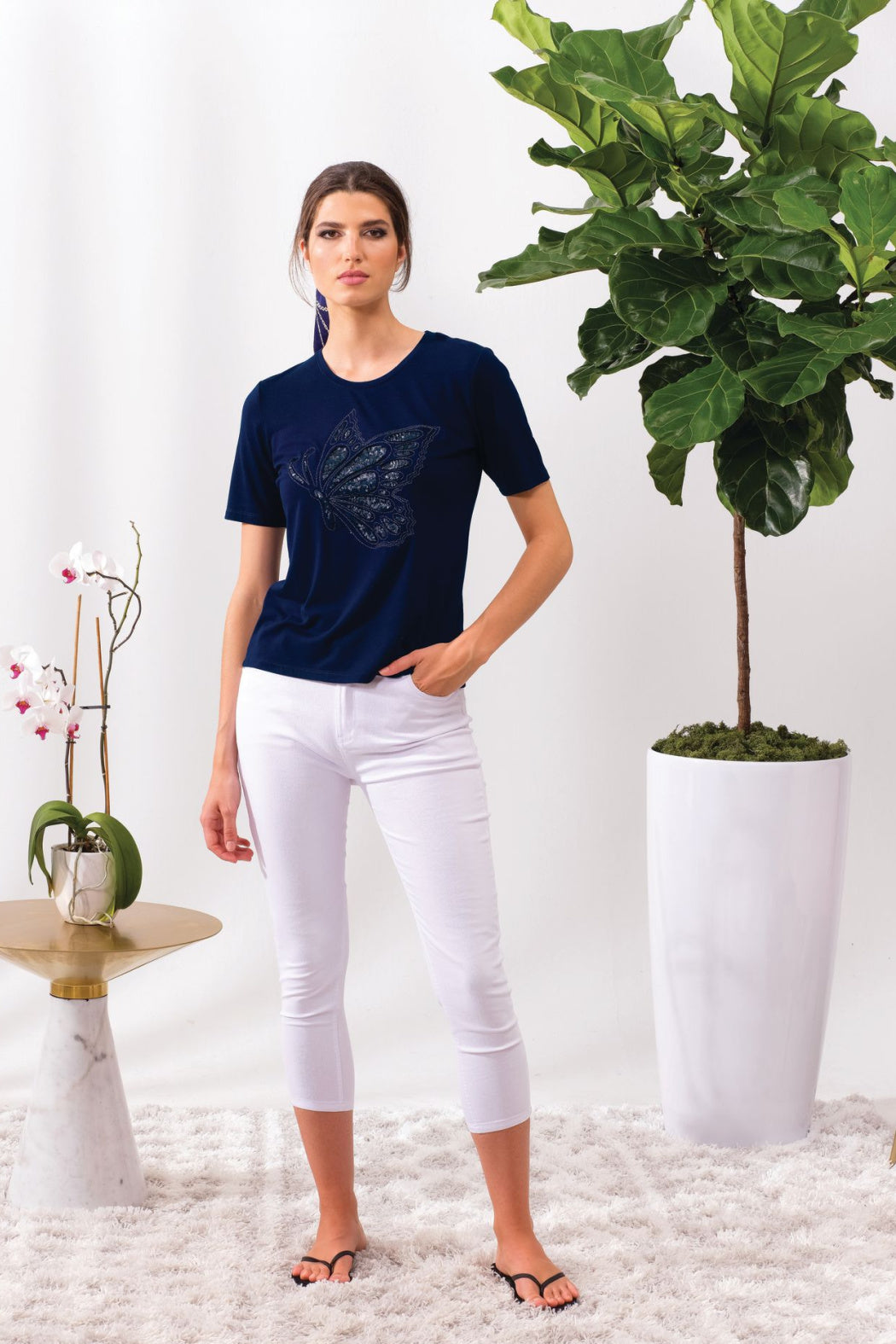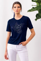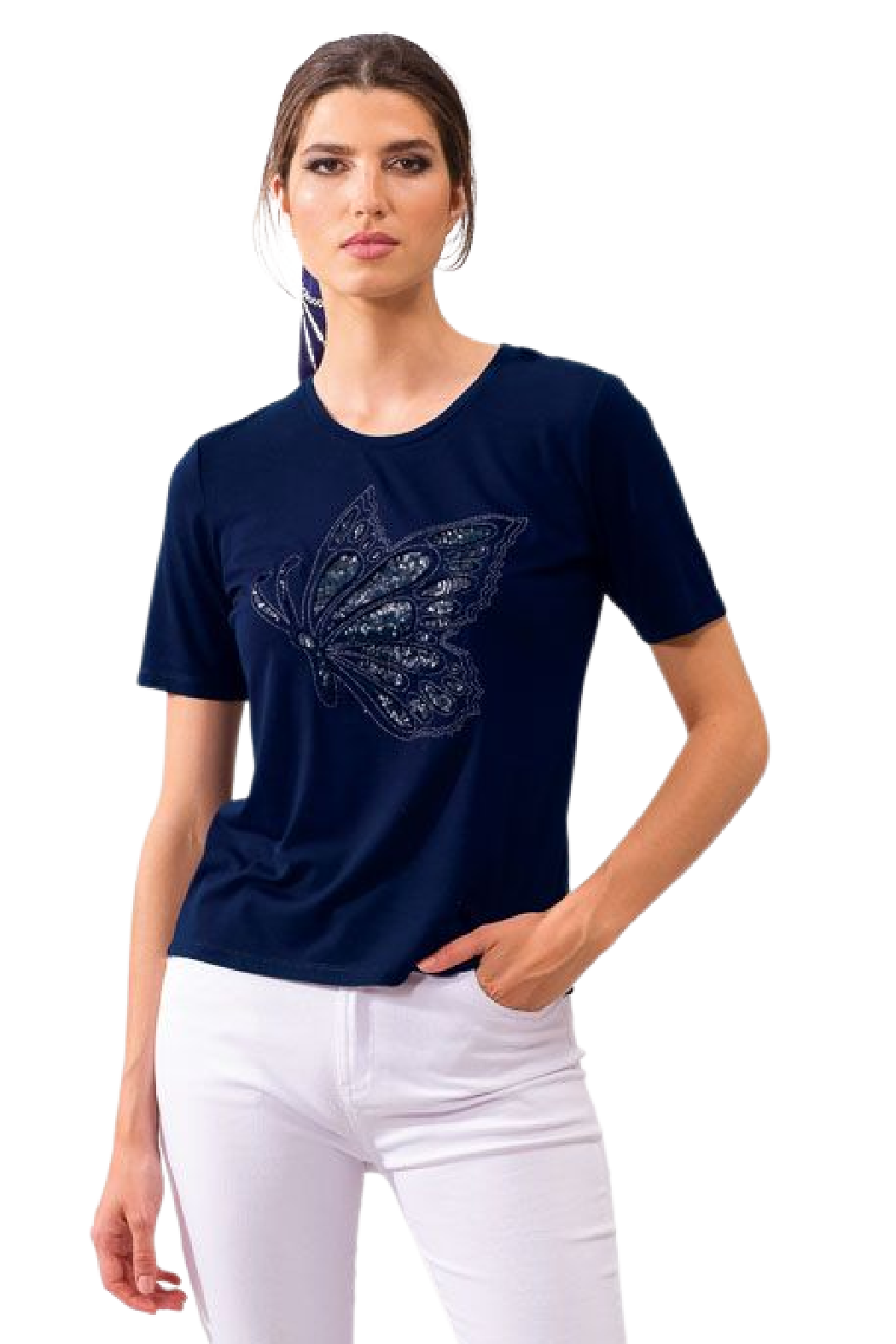 Navy Short Sleeve Tee with Sequin Cut Work Butterfly