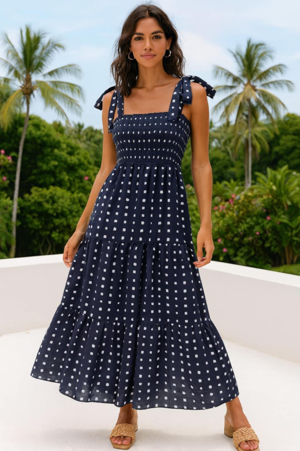 Key Features: Smocked bodice for a flexible, flattering fit Adjustable bow tie shoulder straps Tiered maxi length skirt for graceful movement Lightweight fabric, perfect for warm weather Navy with white square print for modern resort style Ideal for vacations, summer events, or casual elegance